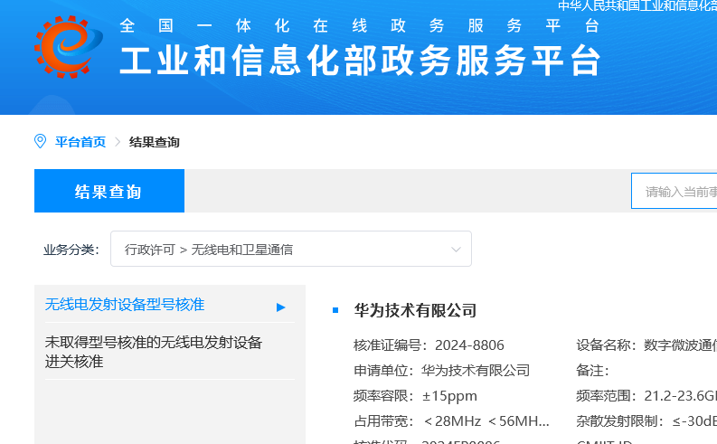 2.点击查询服务-点击结果查询-在全部分类中切换为行政许可,无线电和卫星通信选项-在右侧搜索框内输入证书编号或核准代码或公司名称或以下10种信息任一种都可以查到型号核准证书