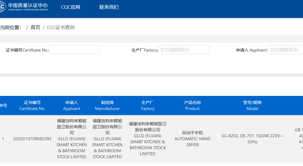 在CCC证书查询一栏中输入已拿到的产品CCC证书编号,就可以查询到产品CCC证书上的信息,包括有制造商,型号规格,产品做的是哪个标准,以及有效日期。